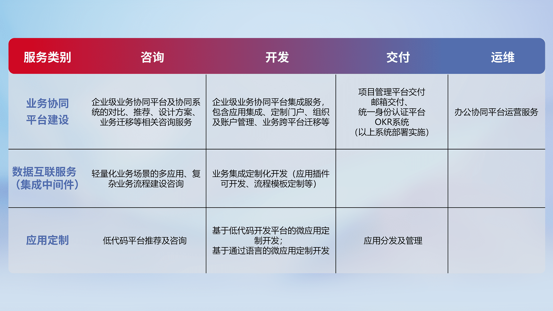 针对钉钉、、企微、、IDaas等平台级产品提供产品的规划、、方案、、、、交付、、、定制化开发等服务,,,,实现如统一协同办公、、、智能客户服务、、、、混合会议管理、、智能数据查询、、、等业务场景,,,,实现数字化转型。。