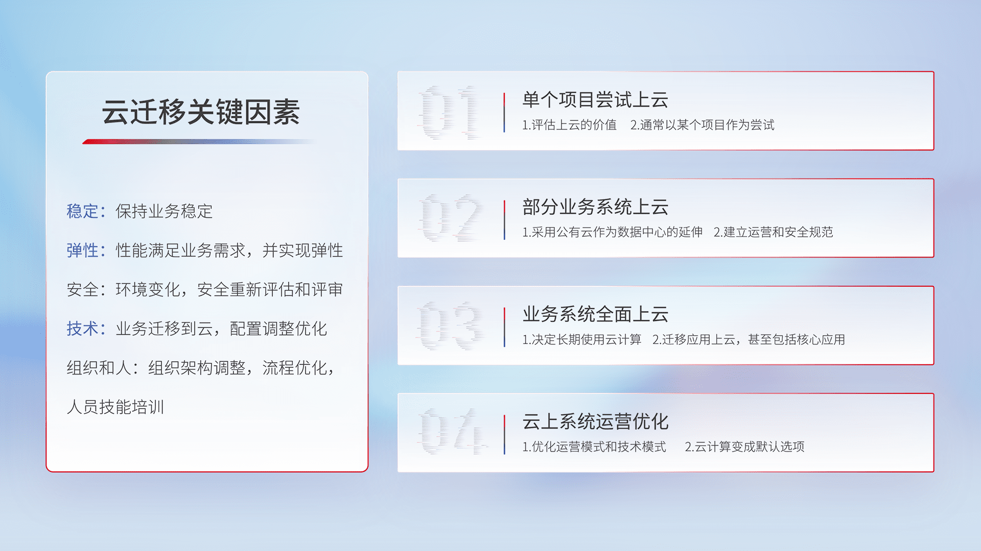 结合实际业务,,从规划设计、、、云平台选型、、、、云原生改造、、、、数据迁移、、集成交付,,,,迁移全过程为客户识别最佳上云路径,,,,做好风险识别管理,,,,设计网络架构、、身份权限、、安全审计合规、、、、操作审计、、日志审计、、、监控告警策略、、、多站点容灾设计等,,对云上基础设施进行整体规划,,,提升IT治理水平,,,,以满足弹性、、、高可用、、高性能的需求。。