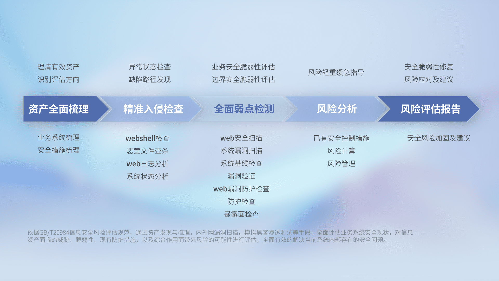 针对客户行业特性,,以专业的安全服务+多厂商联合解决方案提供专属的一站式安全管理服务,,,,帮助客户全面感知网络空间威胁,,,,基于识别、、检测、、分析、、、防护、、、、监测、、响应的服务理论模型,,,从方案咨询、、集成交付、、、、评估验证、、优化加固、、、运维运营,,,,致力于为客户提供完整的闭环管理式安全服务。。。以实战经验为客户打造高抵御风险的安全体系,,帮助客户发现威胁、、、对抗威胁、、、、处置威胁,,不断积累安全对抗能力,,,,持续保障数字化安全。。